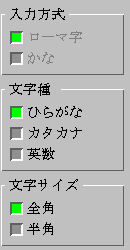 In the 文字種 box, select ひらがな for Hiragana input mode, カタカナ for Katakana input mode, and 英数 for Eisuji input mode