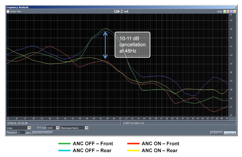 Noise reduction measured at front and rear positions in minivan driving at steady state speed of 65 mph. When enabled, QNX ANC technology delivers up to 11 dB noise reduction at 48Hz.