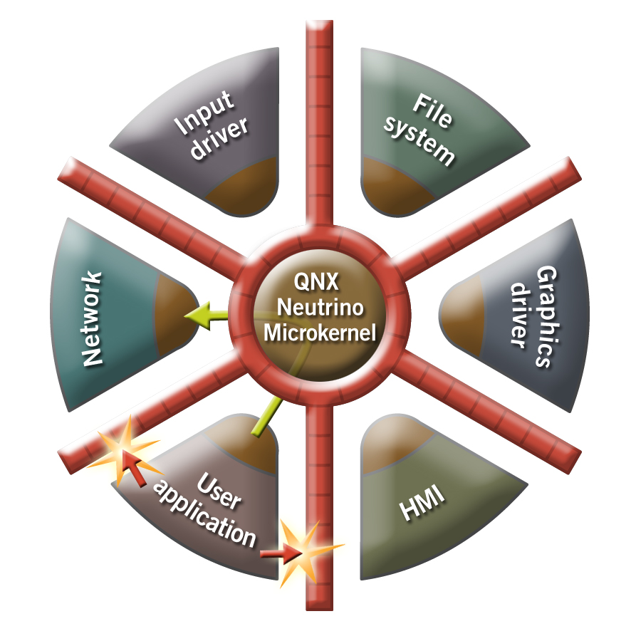 QNX OS for Security provides protective barriers between processes including networking and filesystems, which are typically within the kernel memory space in monolithic operating systems.
